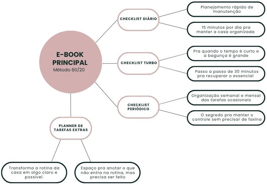 Você recebe um guia prático com o passo a passo para aplicar o método em qualquer cômodo — da sala à cozinha.